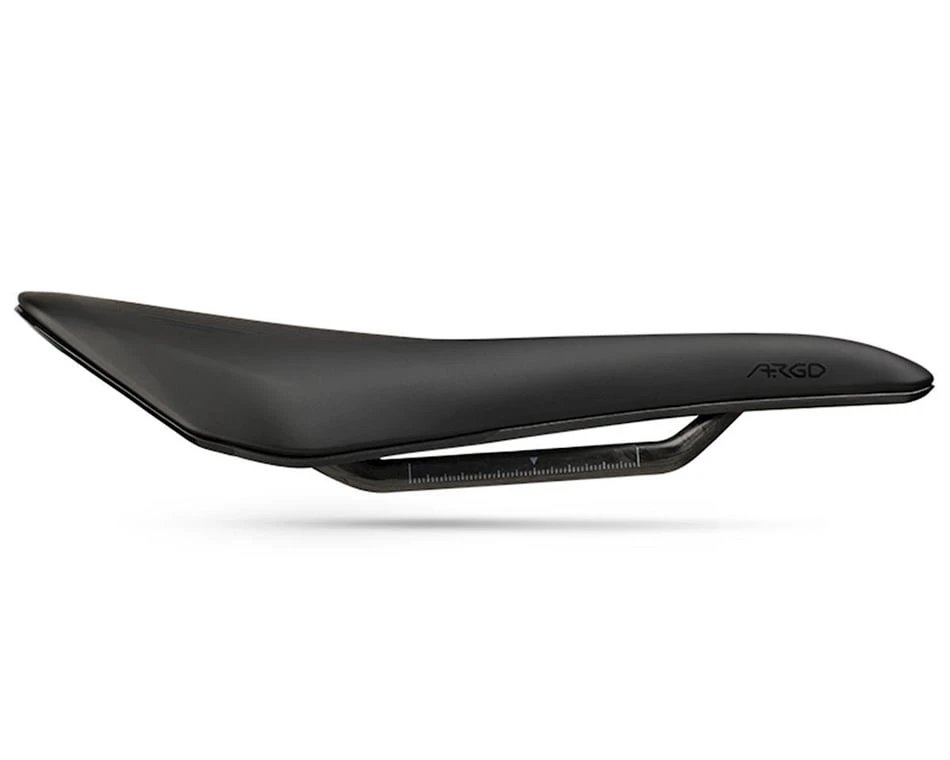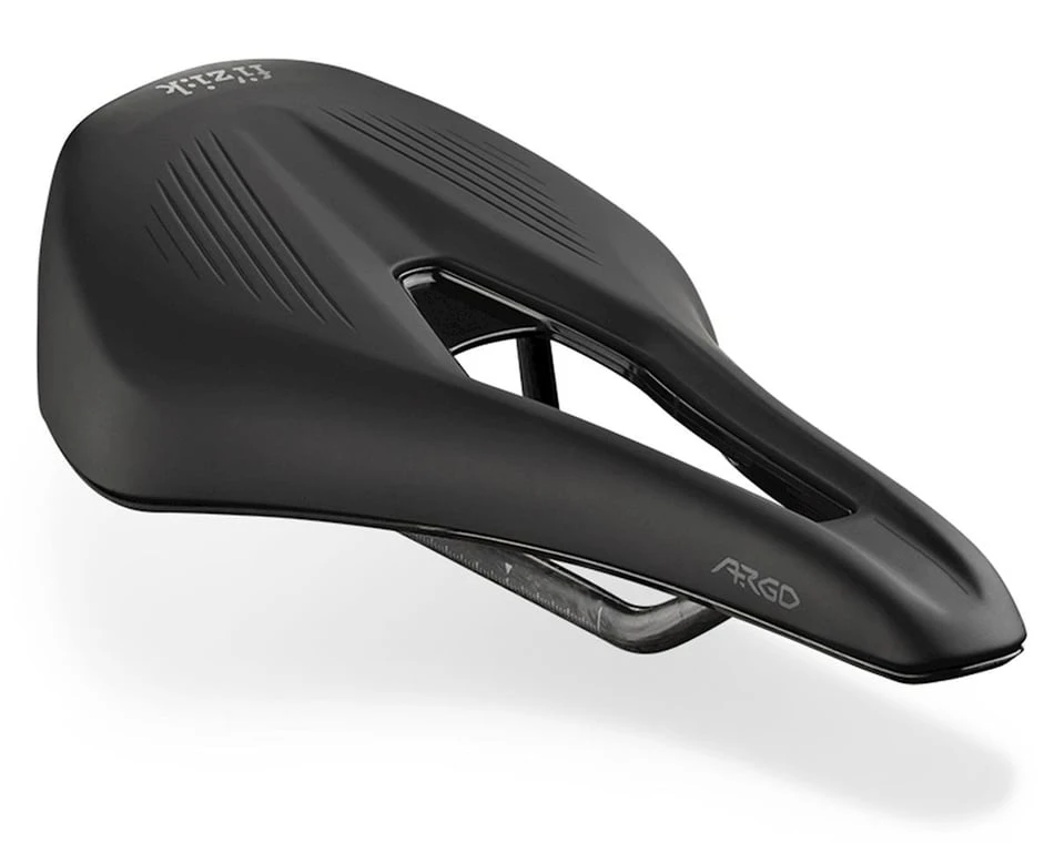 This is the fizik Vento Argo R1 Saddle. With the Argo line, fizik is following the trend of shorter, snubbed nose saddles that allow you to rotate farther forward to get in a more aero position comfortably. The Vento line is designed for riders who get in a more extreme “race” position.