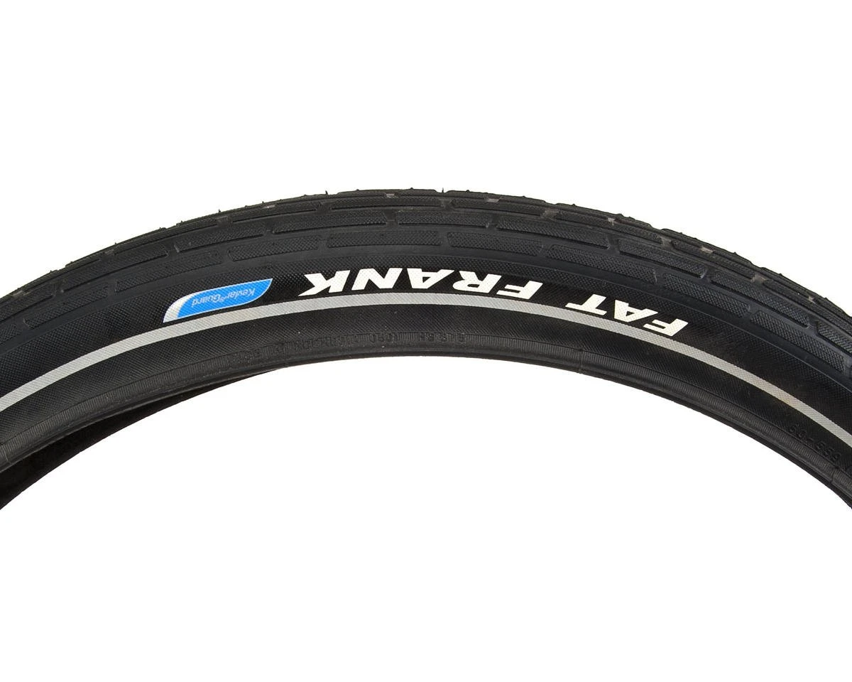 This is the Schwalbe Fat Frank K-Guard Wire Bead Tire, in SBC rubber compound. The Fat Frank from Schwalbe is a cruiser tire for “balloon bikes” that gives your cruiser an incredibly seductive look. The large volume air cushion tire provides a smooth rolling ride, while allowing for the sensation of suspension and dampening, absorbing the bumps in the road so you don’t have to feel them. The addition of K-Guard casing provides puncture resistance at the lower inflation levels required to get that awesome balloon tire effect.