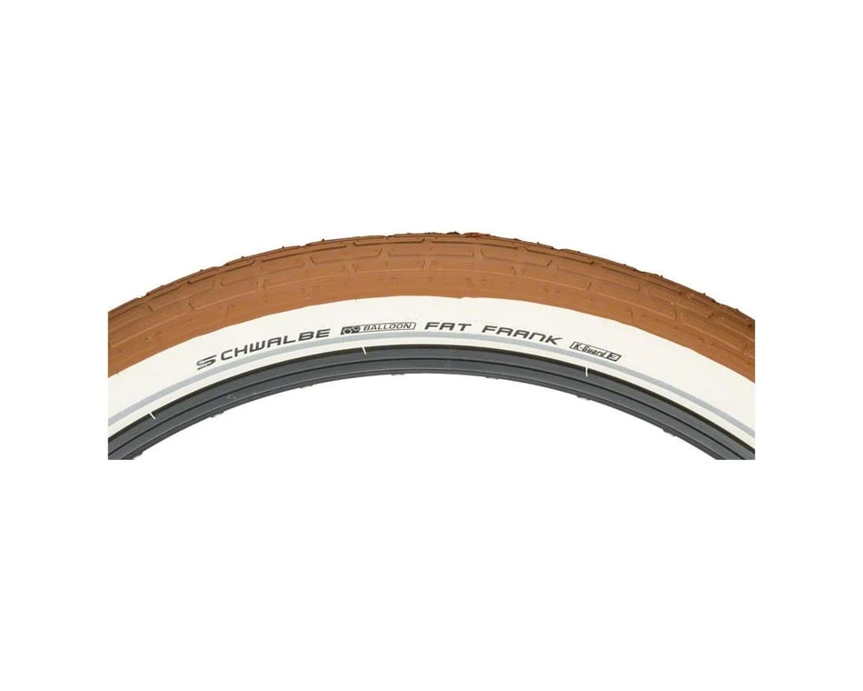 This is the Schwalbe Fat Frank K-Guard Wire Bead Tire, in SBC rubber compound. The Fat Frank from Schwalbe is a cruiser tire for “balloon bikes” that gives your cruiser an incredibly seductive look. The large volume air cushion tire provides a smooth rolling ride, while allowing for the sensation of suspension and dampening, absorbing the bumps in the road so you don’t have to feel them. The addition of K-Guard casing provides puncture resistance at the lower inflation levels required to get that awesome balloon tire effect.